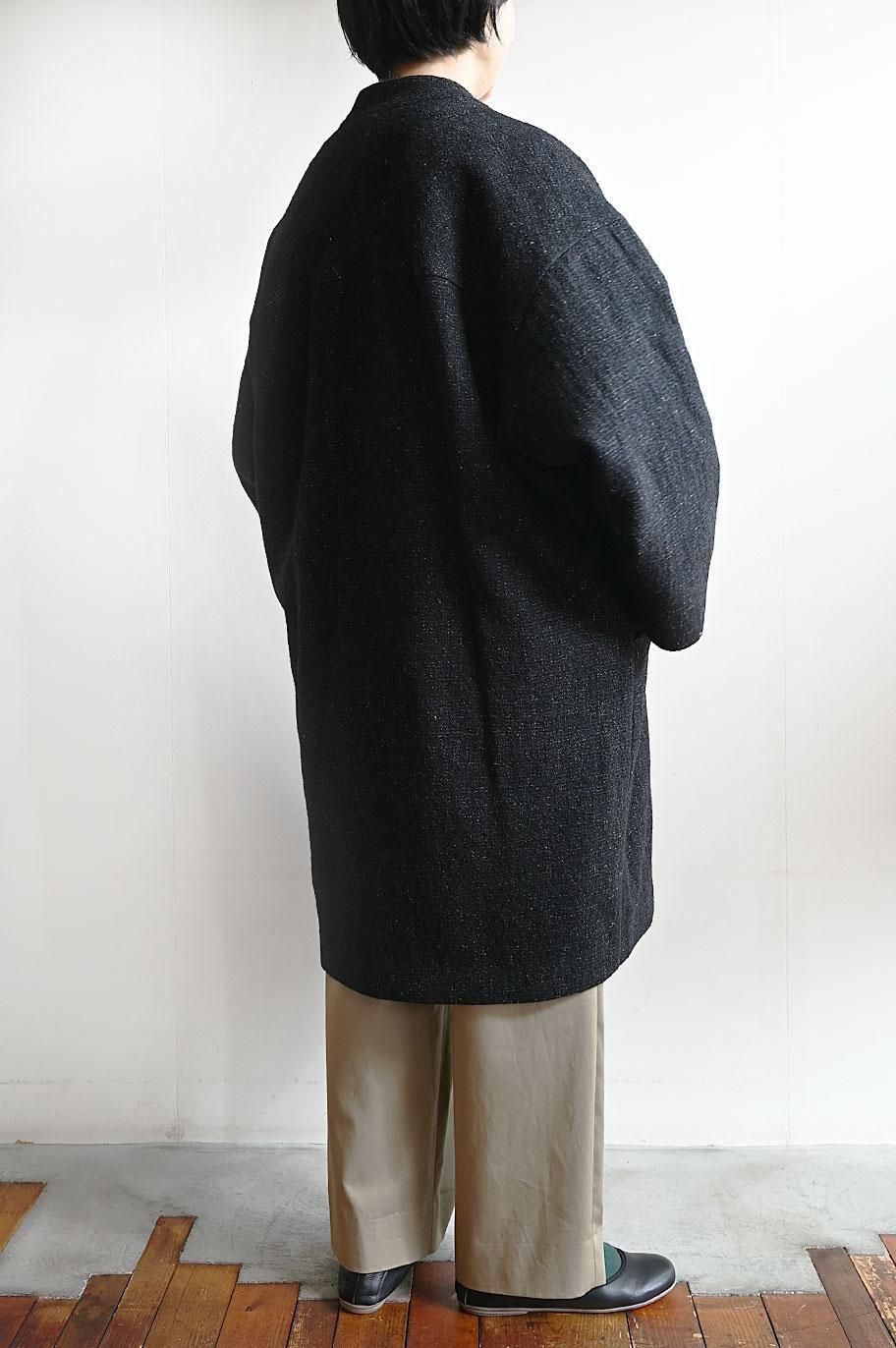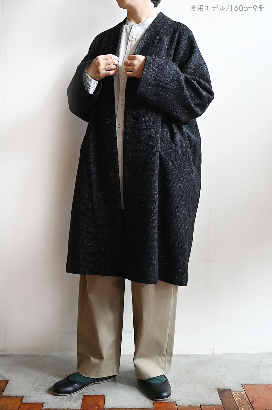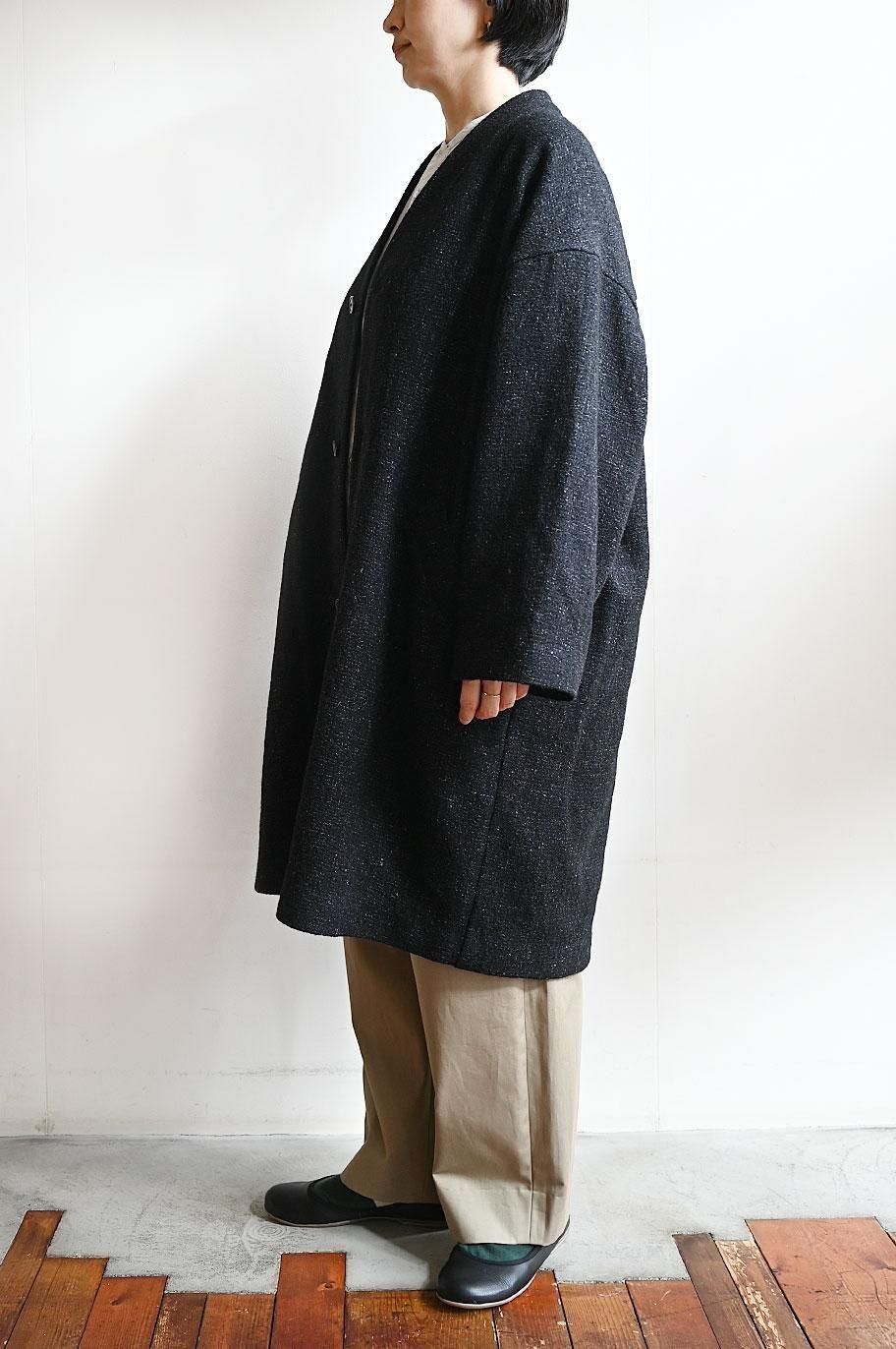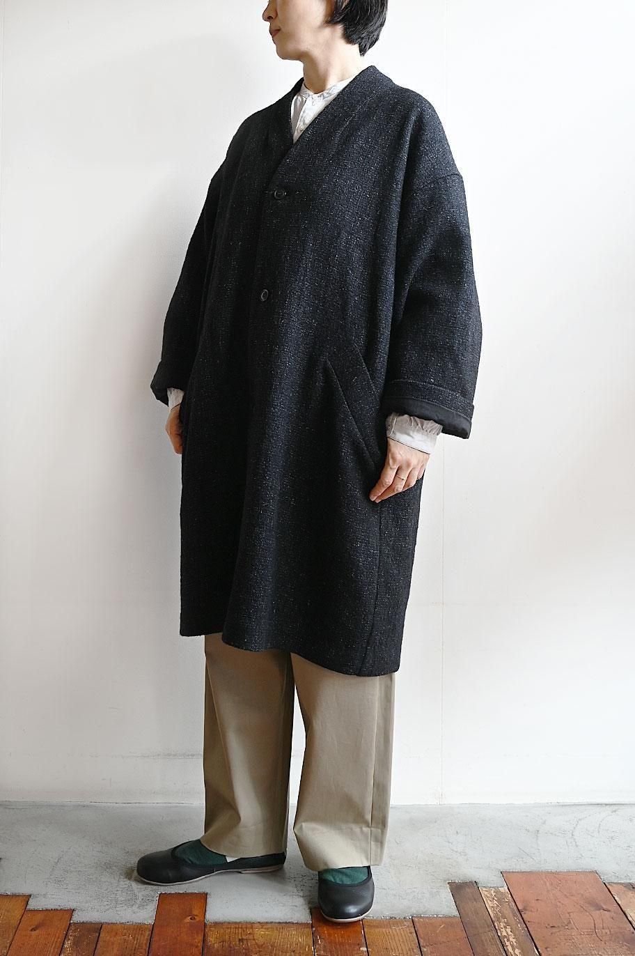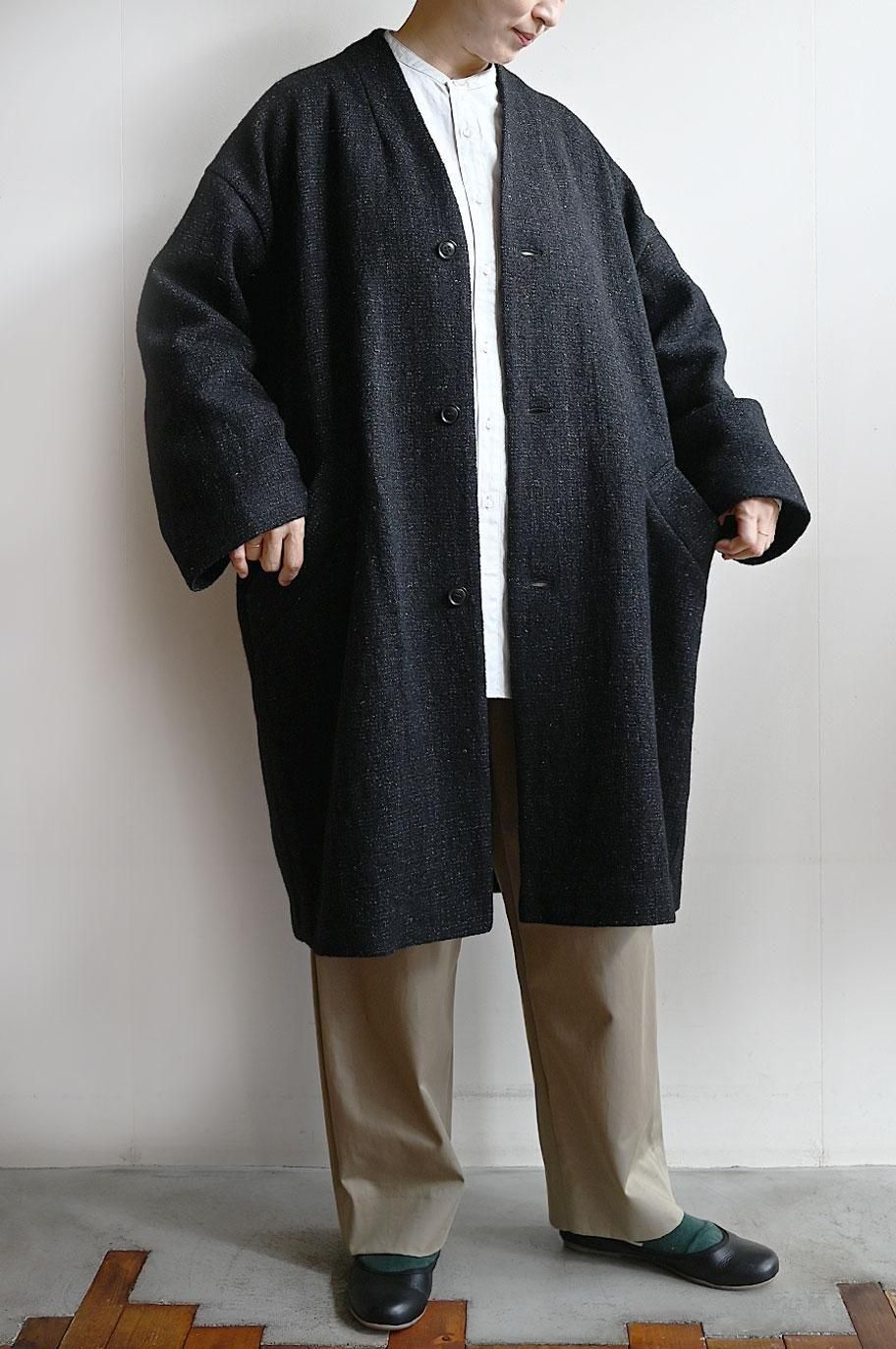 新作の ウールリネン綾織ノーカラーコート