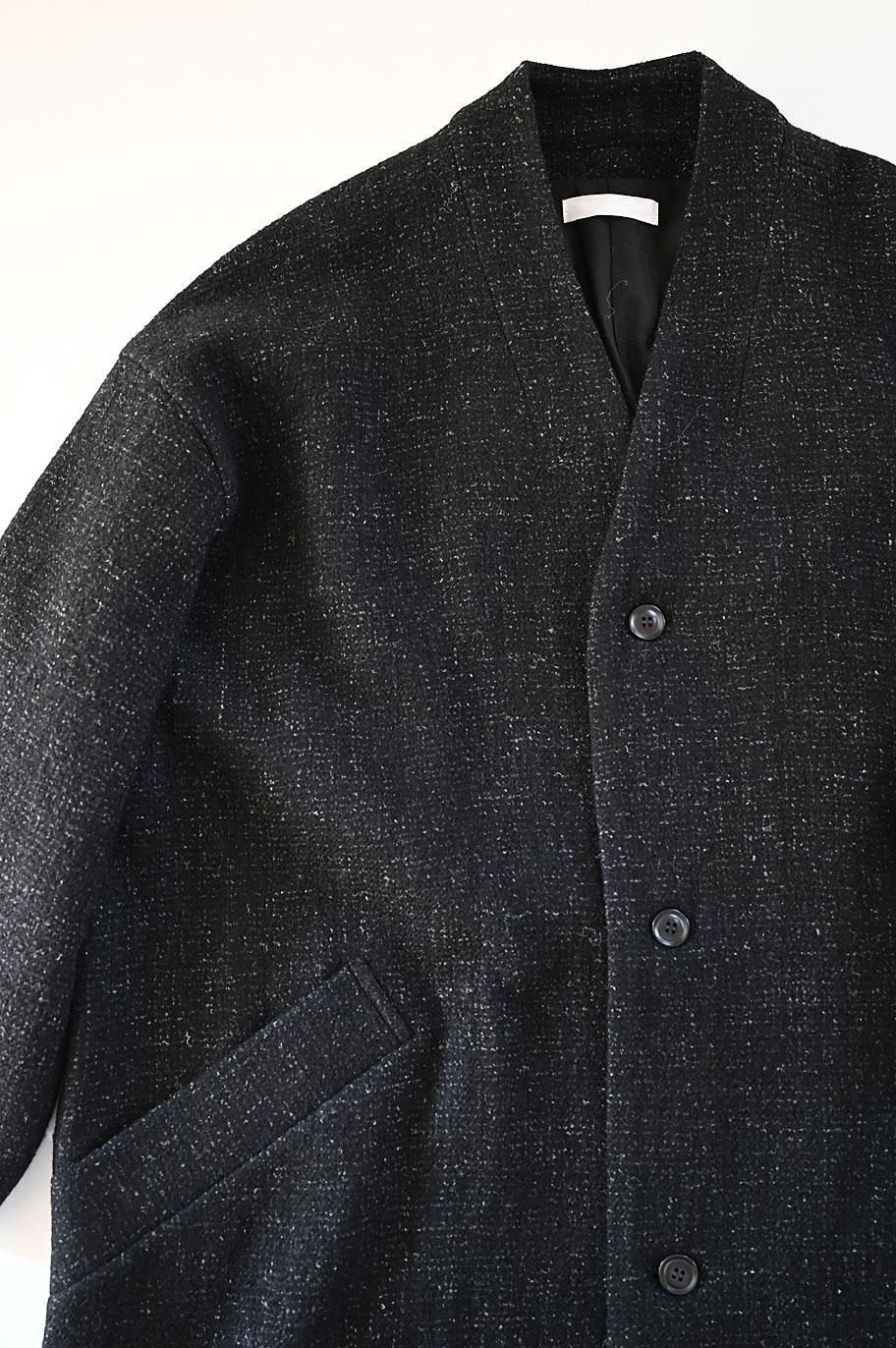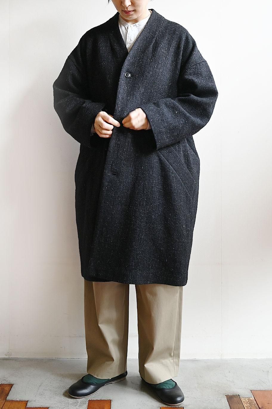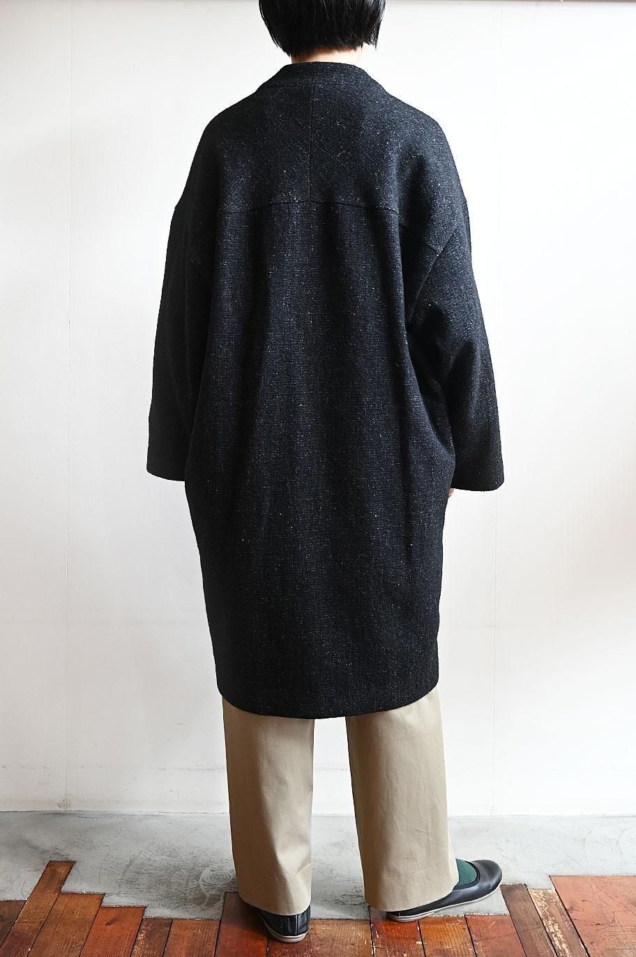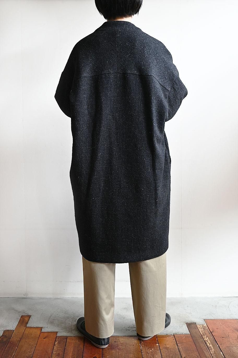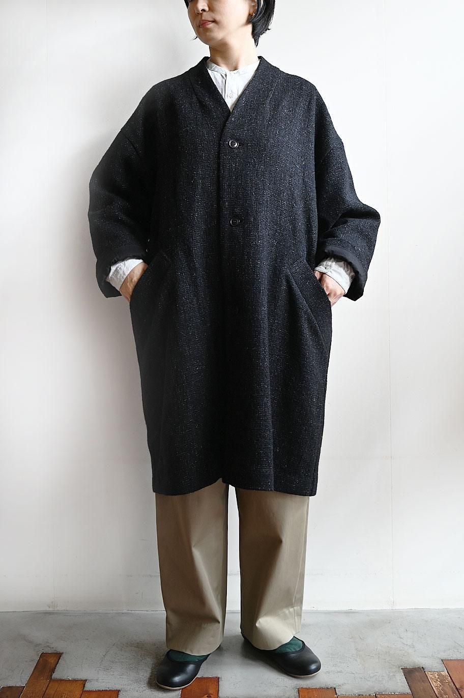 新作の ウールリネン綾織ノーカラーコート